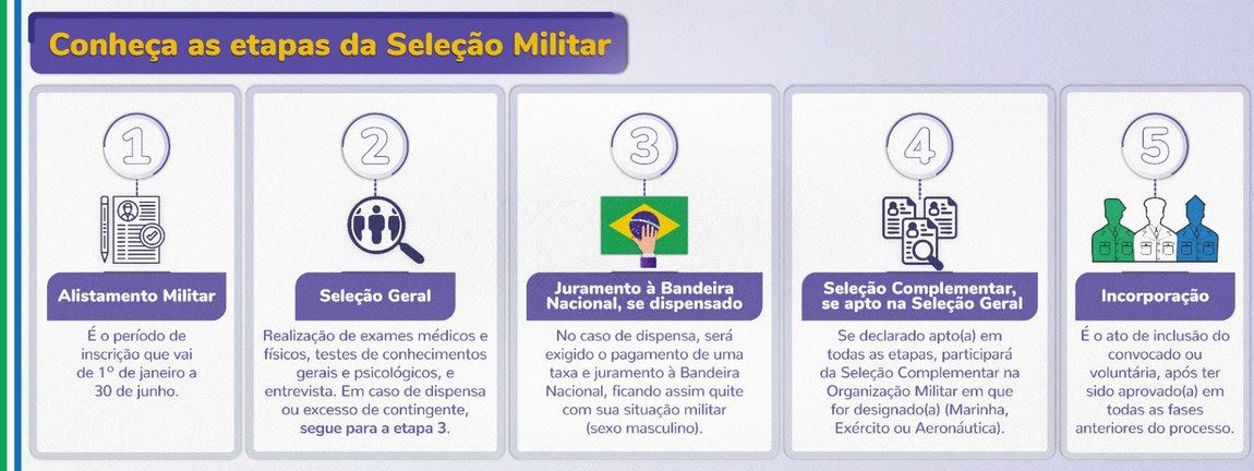 Na sequência, a seleção das alistadas atende aos critérios das Forças Armadas, aos testes físicos e aos resultados de inspeções de saúde, que incluem exames clínicos e laboratoriais. As candidatas que não comparecerem à seleção serão consideradas desistentes.