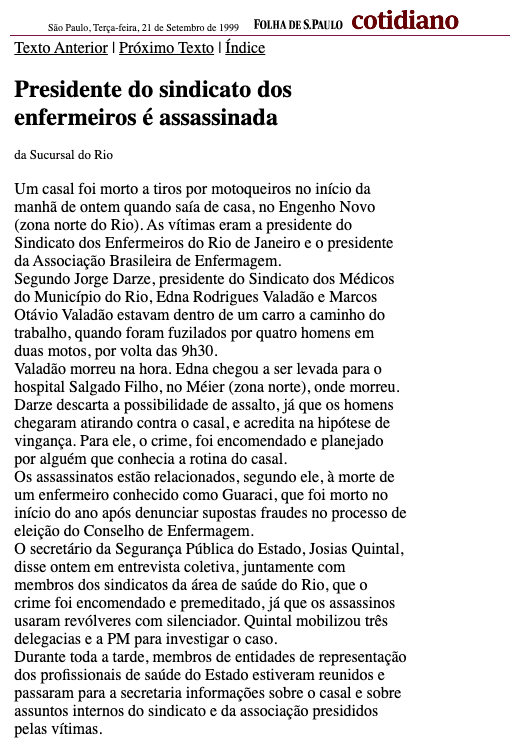 Em reportagem da Folha, à época, apontava o presidente do Sindicato dos Médicos do Município do Rio, Jorge Darze, disse que Edna Rodrigues e Marcos Valadão “estavam dentro de um carro a caminho do trabalho, quando foram fuzilados por quatro homens em duas motos, por volta das 9h30”.