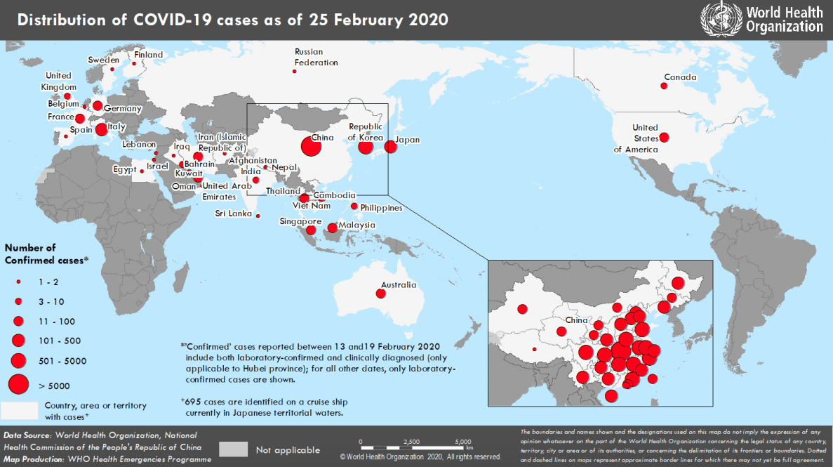 Desde o primeiro caso registrado em Hubei, província que inclui Wuhan, na China, considerada o marco zero de coronavírus, Relatório de Situação da (OMS) apontou, na terça-feira (25/Fev), com 80.239 casos no mundo, e um total de 2.700 mortes, em 34 países.