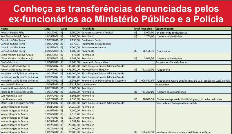 Após 11 anos, da primeira denúncia originada de ex-funcionários e oferecida por diretor do Sindicato dos Empregados em Estabelecimentos de Saúde do DF (SindSaúde-DF), à Polícia Civil do DF (PCDF) do DF indiciou, em janeiro de 2023, parentes da atual presidente, interina, do sindicato sob intervenção, Marli Rodrigues, auxiliar Operacional de Serviços Diversos (AOSD) aposentada da Secretaria de Estado de Saúde do DF (SES-DF), envolvida na transferência, em 2012, de mais de R$ 2,5 milhões, de contribuições de sindicalizados, entre contras de parentes, diretores e funcionários do Sindicato.