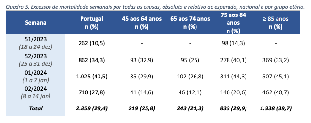 Desde 18 de dezembro, Portugal registrou 2.859 mortes, equivalente a um aumento de 28,4%, acima das estimativas consideradas normais pela Direção-Geral de Saúde (DGS) de Portugal. O caso chama atenção da DGS, de acordo com dados do Relatório de Resposta Sazonal em Saúde – Vigilância e Monitorização, Semana 02/2024 — de 08 a 14 de janeiro de 2024 —, em especial pelos mortes decorrente de doenças do sistema respiratório, em especial a gripe, acentuadas entre grupos etários de 75 anos ou mais. O caso chamou ainda a atenção da comunidade médica, em relação aos falecimentos de pacientes entre 45 e 64 anos.