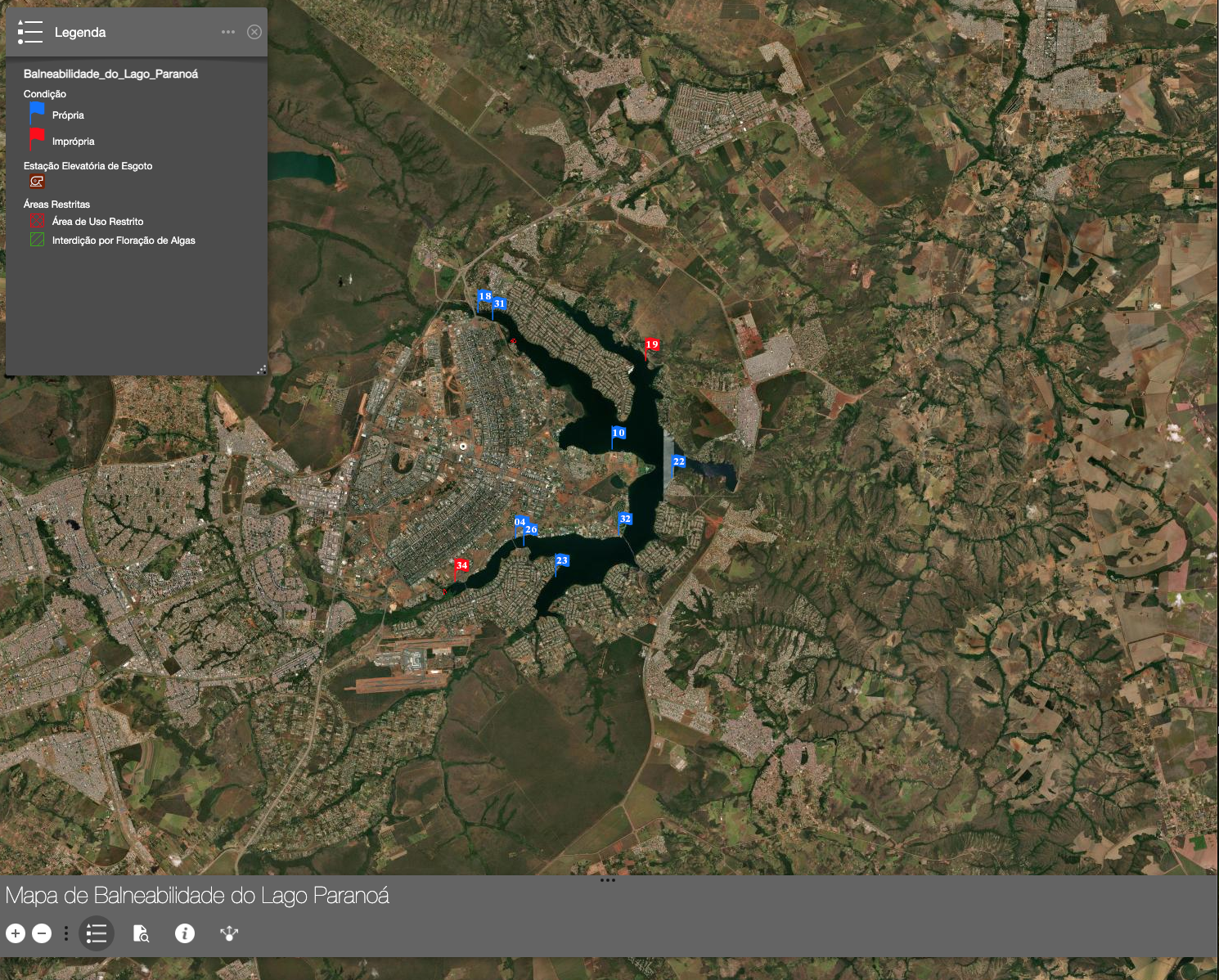 O resultado das análises pode ser acompanhado no Mapa de Balneabilidade, no portal da Caesb. A mais recente avaliação, feita no dia 21 de maio, mostra que estão impróprias para banho e consumo as águas próximas à ETE do Lago Norte, à ETE do Lago Sul, a área perto ao Serviço de Limpeza Urbana (SLU) na Asa Sul e o piscinão do Lago Norte. O restante está liberado.
