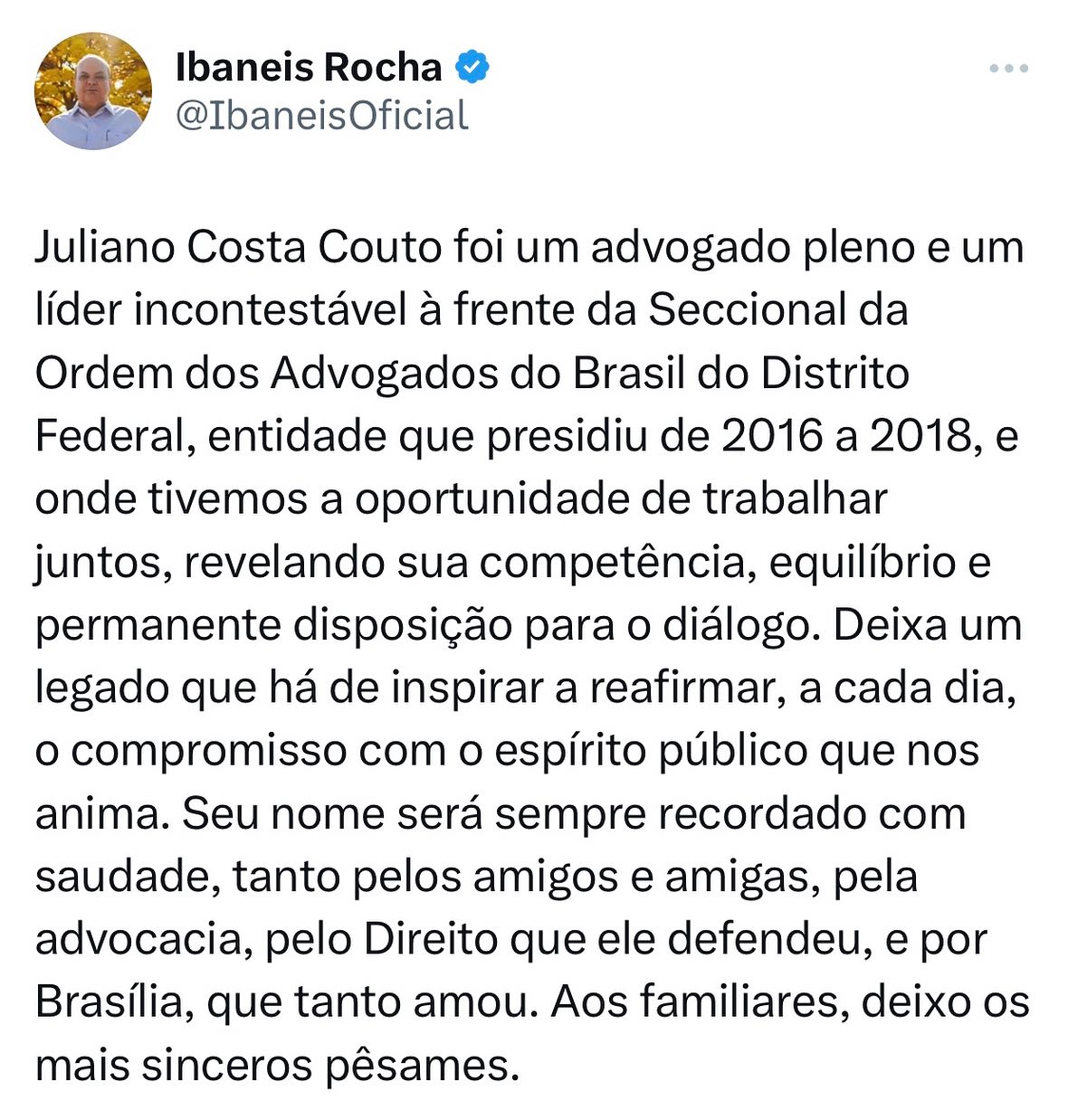 O governador do DF, Ibaneis Rocha (MDB) lamentou a morte, neste domingo (28/Abr), do advogado e ex-presidente da Ordem dos Advogados do Brasil Seccional do Distrito Federal (OAB-DF), Juliano Costa Couto, além de declarar luto oficial por três dias, medida publicada em edição extra do Diário Oficial do Distrito Federal (DODF). A vice-governadora do DF, Celina Leão (Progressita), também expressou pesar pelo falecimento de Costa Couto.