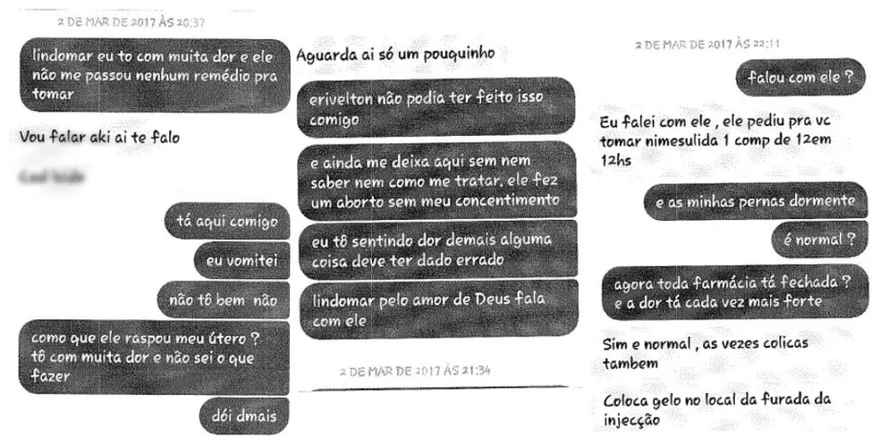 A mulher cita na conversa que ele fez o aborto sem o consentimento dela e que estava sentindo muita dor e com medo. Lindomar teria dado orientações sobre medicação e alimentação e que não era para a vítima se preocupar, pois os sintomas eram ‘normais’, segundo informação do Erivelton.