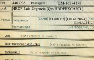O médico afirmou ainda que as ampolas recebidas de outras unidades de saúde estão prestes a vencer e apontou a falta de outros medicamentos e insumos. “Não é apenas essa medicação que vem faltando. Vem faltando uma série de exames básicos (incluindo CKMB [marcador para detecção de lesões no miocárdio,] e Troponina para diagnóstico de infarto, tomografia, gasometria, gerador de marca-passo, etc)”, disse.