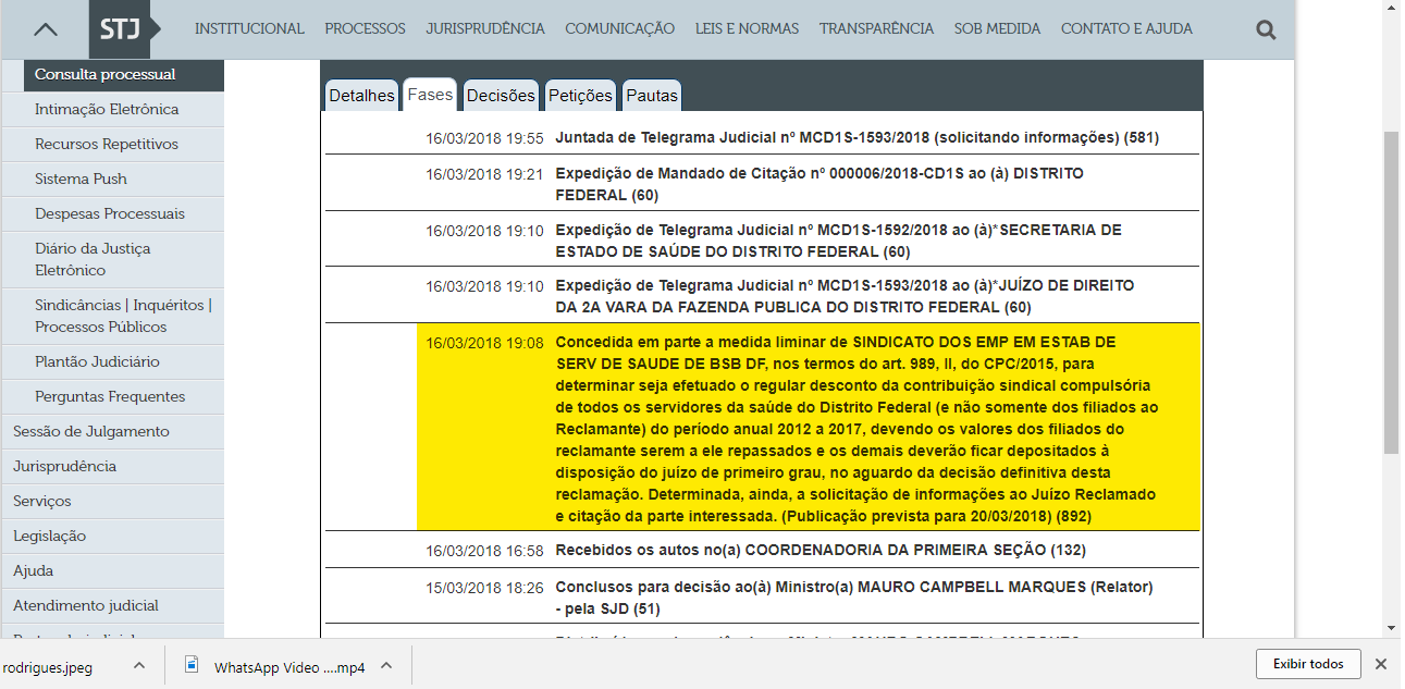 Porém, em outra investida do sindicato, junto ao STJ, a Rcl nº 35595 / DF (2018/0059213-4) autuada em 15/03/2018, a entidade sindical contestou a decisão em tribunal de primeiro grau do TJDFT, por supostamente, reformar decisão de Tribunal Superior. Com isso, o sindicato, obteve o reconhecimento parcial, de liminar, que garante o desconto de todos os servidores da SES-DF. Notícia essa, publicada neste domingo (18/Mar), pelo blog Nanda Oliveira.