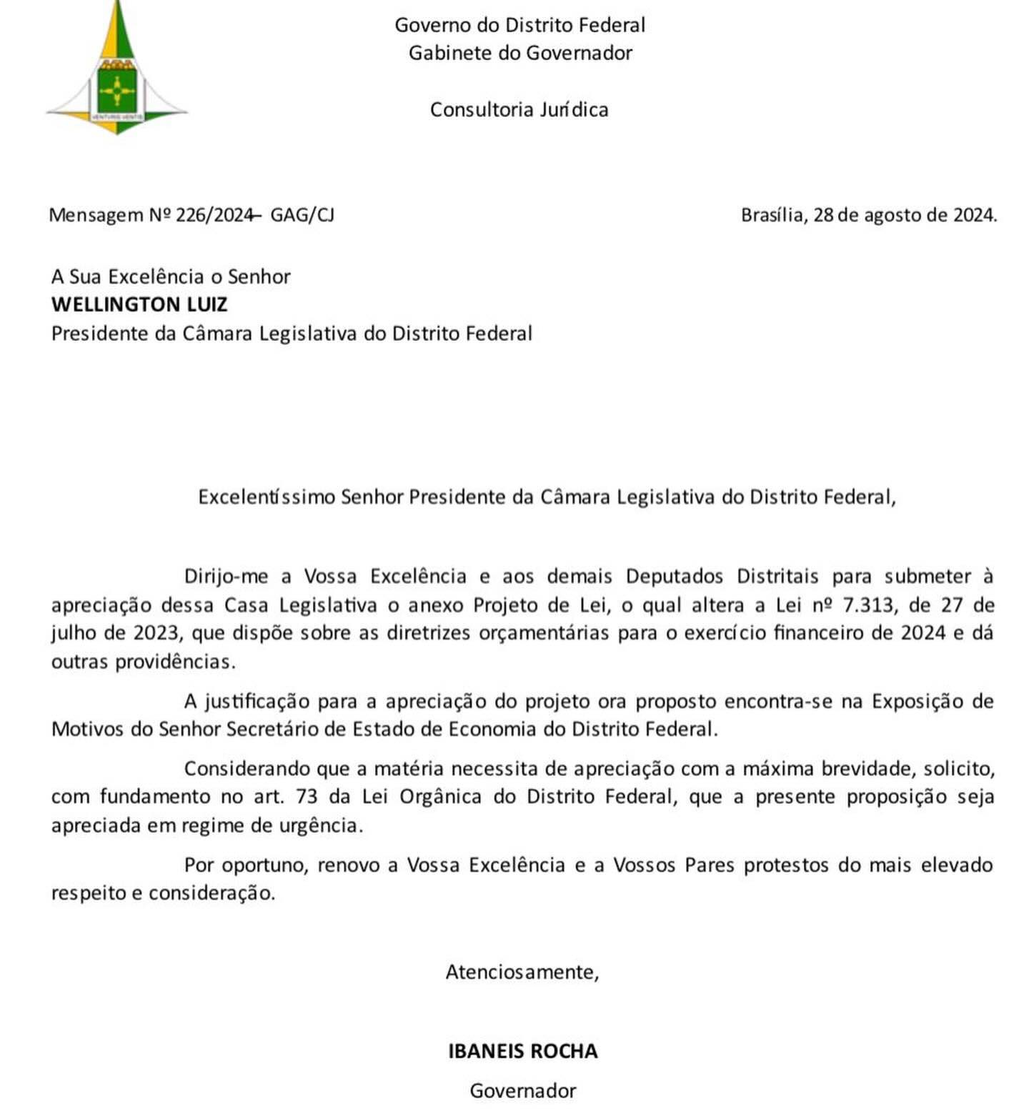 O governador do DF, Ibaneis Rocha (MDB), enviou à Câmara Legislativa do Distrito Federal (CLDF), na quinta-feira (29/Ago), o Projeto de Lei (PL) 1.266/2024, que altera a Lei 7.313/2023, de Diretrizes Orçamentárias (LDO) do DF. Dentre as principais alterações estão a reestruturação da carreira e a concessão de 15% de reajuste salarial aos técnicos em Enfermagem. A notícia foi adiantada pelo deputado distrital, Jorge Vianna (PSD), por meio das redes sociais, ao informar a apreciação por parte da CLDF, na próxima semana.