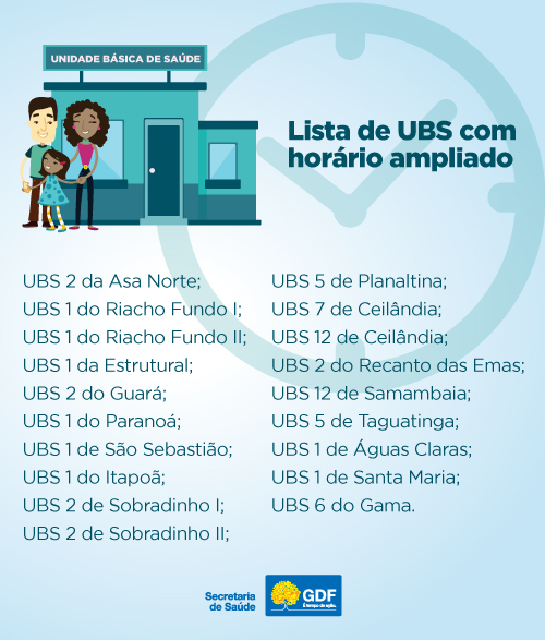 O atendimento à população começou a ser reforçado na Atenção Primária, a partir desta sexta-feira (1/11). Ao todo, 19 unidades básicas de saúde (UBS) terão o horário de funcionamento ampliado para até as 22 horas (lista abaixo). A iniciativa, que começou de forma experimental na UBS 5 de Taguatinga, será implementada em unidades com o maior número de servidores, espalhadas por todo o Distrito Federal.
