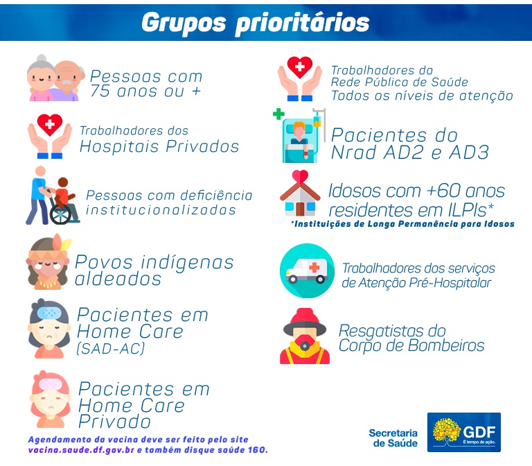 O dado da estimativa populacional é da Companhia de Planejamento do Distrito Federal (Codeplan). A vacinação continua para os integrantes do grupo prioritário já selecionado, mas que ainda não recebeu a primeira ou a segunda dose do imunizante.