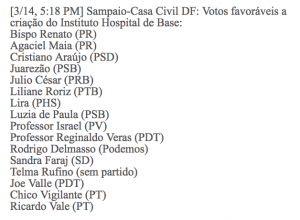 Poucas horas após o governador do DF, Rodrigo Rollemberg (PSB), entregar a proposta do agora, Projeto de Lei (PL) 2846/2017, que institui o Instituto Hospital de Base do DF (IBHDF)(14/Mar), o chefe da Casa Civil, Relações Institucionais e Sociais do DF (SERIS-DF), Sérgio Sampaio, surge como suposto emissor de uma mensagem via Whatsapp, em que menciona os 16 deputados “com votos favoráveis a criação do Instituto Hospital de Base”.