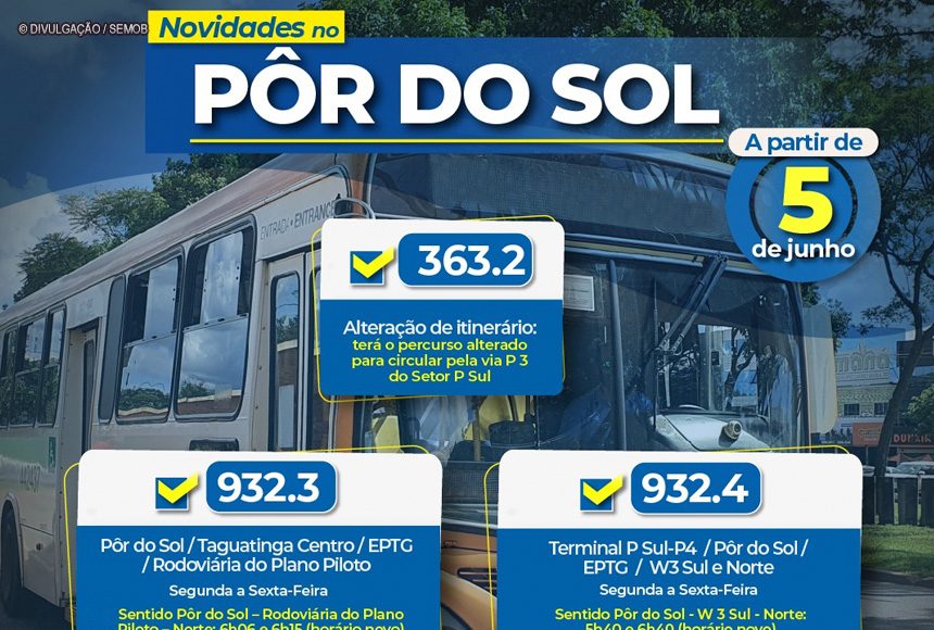 De acordo com a SemobDF, viagens de segunda a sexta-feira, a linha 932.4 devem contar com novo horário, no sentido Pôr do Sol / W3 Norte – Sul, com partida às 6h40 da manhã e retorno às 18h40. A linha 932.3, por sua vez, tem como destino a Rodoviária do Plano Piloto, que passa a ganhar uma viagem às 6h15 e com volta para o Pôr do Sol às 18h15.