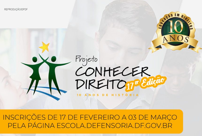 Começam nesta segunda-feira (17) as inscrições para a 17ª turma do Projeto Conhecer Direito. As aulas terão início no dia 05 de março e podem participar estudantes do 1º ao 3º ano do Ensino Médio. Para se inscrever e concorrer às vagas, os interessados devem fazer a pré-matrícula na página escola.defensoria.df.gov.br e entregar os documentos (formulário preenchido, certidão de nascimento ou RG, comprovante de residência, declaração de escolaridade e uma foto 3×4) presencialmente na sede da Escola de Assistência Jurídica da Defensoria Pública do Distrito Federal (Easjur/DPDF) até o dia 03 de março.