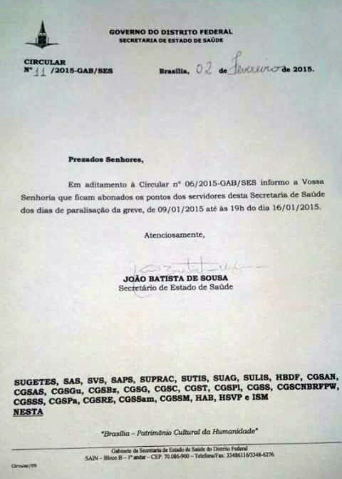 Vale observar, que o próprio Rollemberg se utilizou da prerrogativa de abonar pontos de grevistas. Em fevereiro de 2015, ocasião em que o então secretario de Saúde, João Batista de Souza autorizou, por meio da Circular nº 11/2015-GAB/SES, o abono dos dias 9 à 16 de janeiro daquele ano, dos servidores da SES-DF participaram de greves ou paralisações.