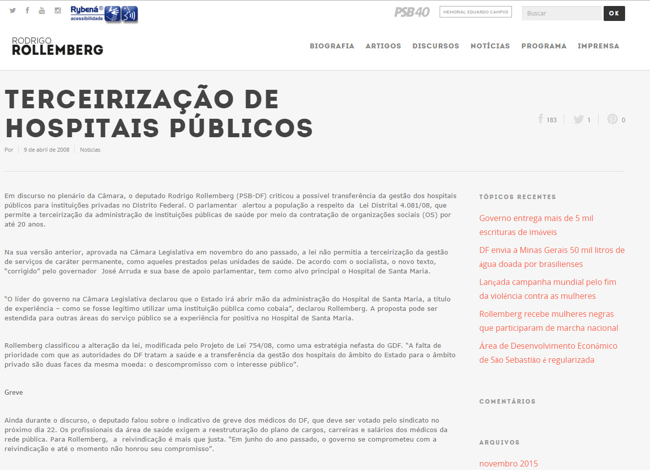 Mas em 2008, na ocasião, deputado federal pelo PSB, Rollemberg, publicou matéria em que criticou possível transferência da gestão dos hospitais públicos no DF, por instituições privadas. Na ocasião o chefe do Executivo se referia, especificamente, as OSs. Questionado pelo Blog sobre a mudança de opinião,