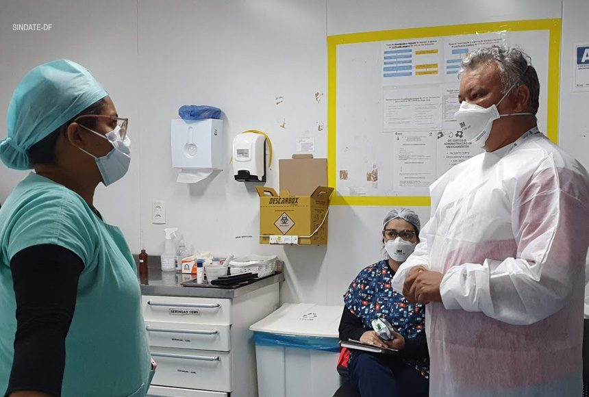 Durante a fiscalização, o grupo composto pelo diretor do Sindate-DF Newton Batista, pela representante do Conselho de Saúde, Jeovânia Rodrigues e do Coren-DF, Tiago Pessoa, verificou o fornecimento de Equipamentos de Proteção Individual (EPIs), e o dimensionamento da equipe de Enfermagem.