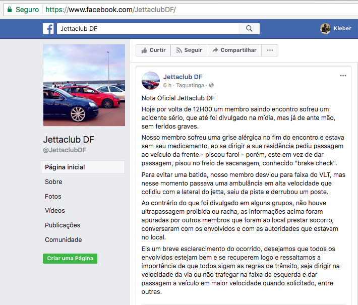 Porém, após o ser noticiado o acidente, uma comunidade no Facebook, sob o nome JettaClub DF, publicou nota esclarecendo as condições em que o acidente aconteceu. “Nosso membro sofreu uma grise alérgica no fim do encontro e estava sem seu medicamento, ao se dirigir a sua residência pediu passagem ao veículo da frente – piscou farol – porém, este em vez de dar passagem, pisou no freio de sacanagem, conhecido ‘brake check’. Para evitar uma batida, nosso membro desviou para faixa do VLT, mas nesse momento passava uma ambulância em alta velocidade que colidiu com a lateral do jetta, saiu da pista e derrubou um poste.”.