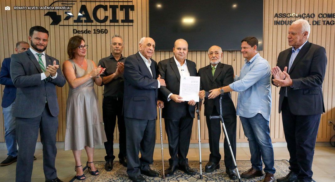 O Governo do Distrito Federal (GDF) formalizou, nesta quinta-feira (27/Nov), a entrega da escritura pública de concessão de direito de uso à Associação Comercial e Industrial de Taguatinga (Acit). O documento, entregue pelo governador Ibaneis Rocha, regulariza oficialmente a ocupação da entidade, instalada há cerca de 50 anos no setor industrial da região.
