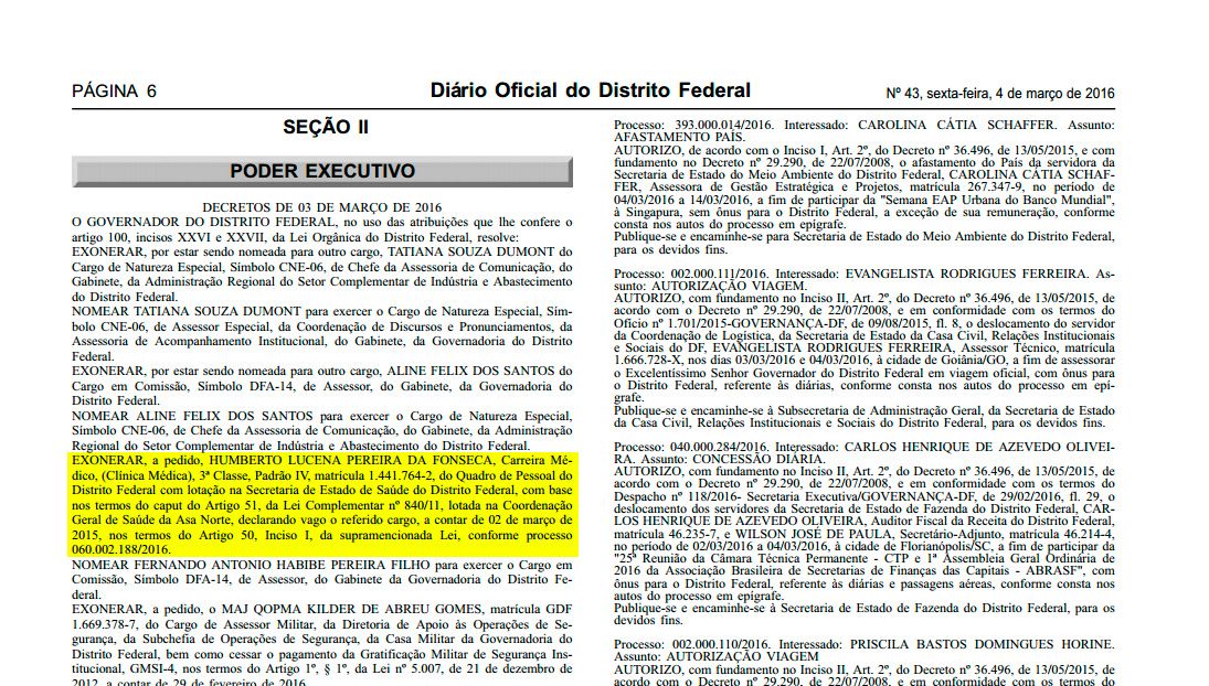 Na quinta-feira (3/Mar), o governador, Rodrigo Rollemberg, assinou decreto em que exonerou Fonseca da função de médico, com data retroativa à 2 de março. A publicação foi realizada em Diário Oficial do ontem (4/Mar).