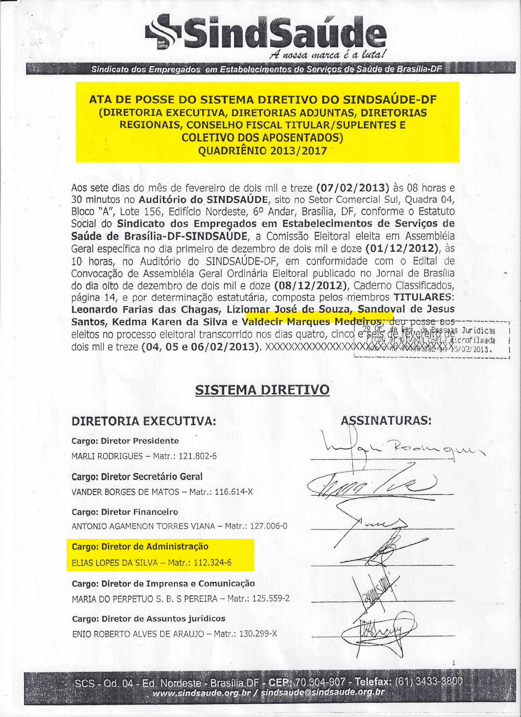 “Consta nos autos do processo nº 414000121/2013, na folha 86, a Ata da Assembleia Geral Extraordinária do Sindicato dos Empregados em Estabelecimentos de Serviços de Saúde/SindiSaúde, realizada no dia 11 de Dezembro de 2014, devidamente registrada no cartório do 2º Ofício de Pessoas Jurídicas sob o nº 000090062 em 26/12/2014 onde decidiu-se pela escolha do dirigente sindical Rodrigo Conde de Oliveira – matrícula funcional nº 179636-4 assinada pelos diretores presidente e de formação sindical.”.