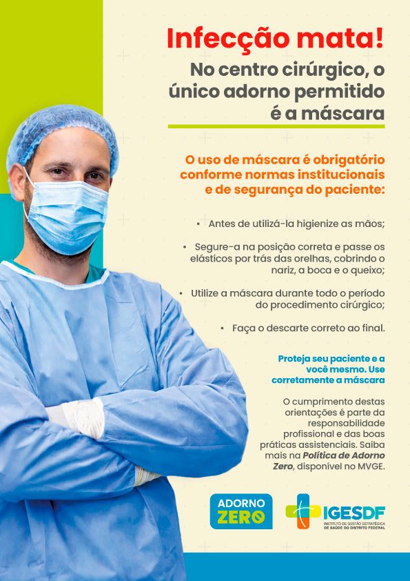 O Centro Cirúrgico do Hospital de Base do Distrito Federal (HBDF), unidade gerida pelo Instituto de Gestão Estratégica de Saúde (IgesDF), iniciou uma campanha de conscientização para reforçar a política “adorno zero”. Conforme divulgado em (19/Fev), a iniciativa proíbe o uso de acessórios por colaboradores durante o trabalho para reduzir o risco de infecções e fortalecer a segurança do paciente na unidade hospitalar.