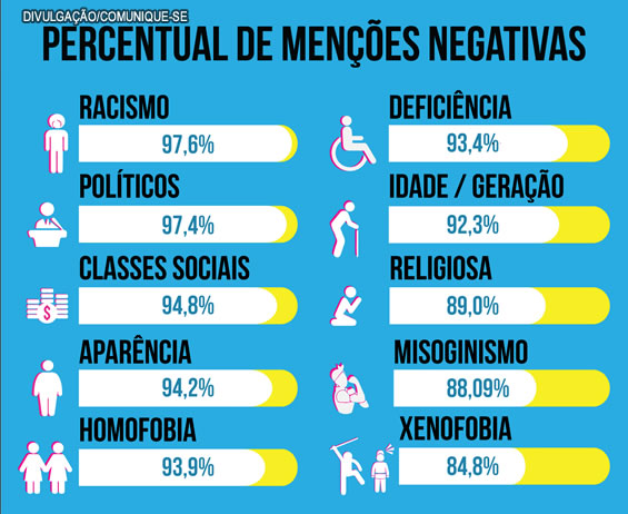 No total, foram analisadas 393.284 menções feitas por internautas de todo o país no Facebook, Twitter e Instagram e também em páginas de blogs e comentários de sites da internet. A varredura encontrou dez tipos principais de intolerâncias, identificadas pelo uso de expressões como “cabelo ruim”, “retardado mental”, “boiola”, “mal comida” , “golpista”, “velho” e “nega”.
