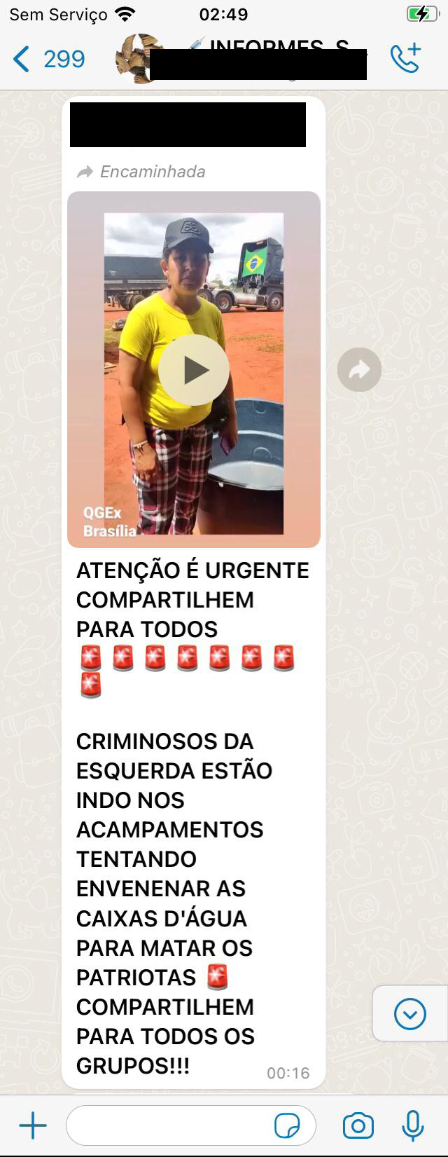 Estranhamente, após o episódio, os manifestantes golpistas publicaram um vídeo em que uma mulher, acampada no QG do Exército, divulgou uma fake news sobre o caso, com a chamada “Criminosos da esquerda estão indo nos acampamentos tentando envenenar as caixas d’água para matar os patriotas.”.