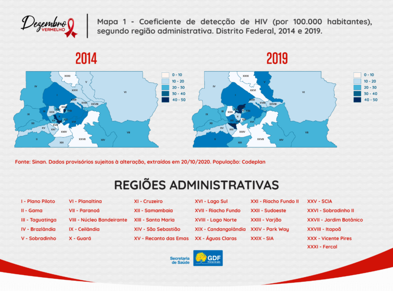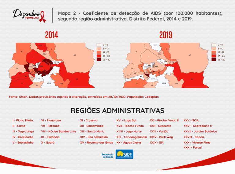 Dos casos de Aids, o Paranoá se manteve com o coeficiente de detecção entre 17 e 23 casos por 100 mil habitantes entre 2014 e 2019. Também ficaram estáveis as regiões de Sobradinho II, Santa Maria, Ceilândia, Riacho Fundo II, Varjão e Planaltina, com coeficiente de 6 a 12 casos por 100 mil habitantes. As demais regiões administrativas apresentaram redução, sendo a mais significativa no Lago Norte, que tinha em 2014 o coeficiente de detecção de 23 a 30 casos por 100 mil habitantes regredindo para 0 a 6 casos em 2019. Veja o mapa: