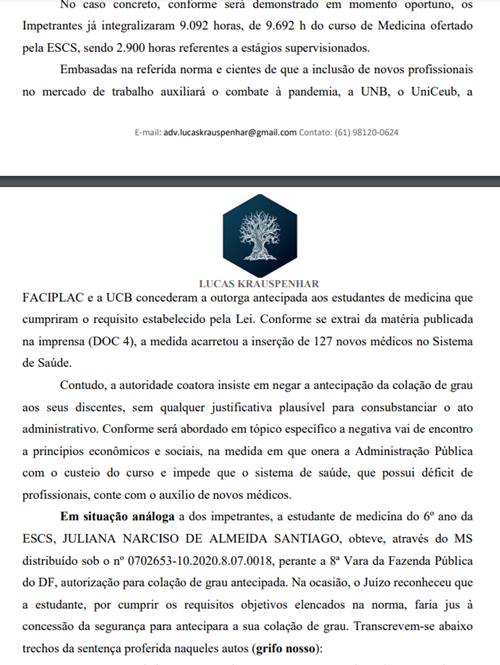 Na peça, o advogado contextualiza que outras instituições de ensino do Distrito Federal, incluindo a Universidade de Brasília (UnB), concederam a outorga antecipada aos estudantes de medicina que cumpriram o requisito estabelecido pela lei vigente. Krauspenhar também cita uma decisão favorável para uma estudante da ESCS, que conseguiu na Justiça o direito de colar o grau de forma antecipada.