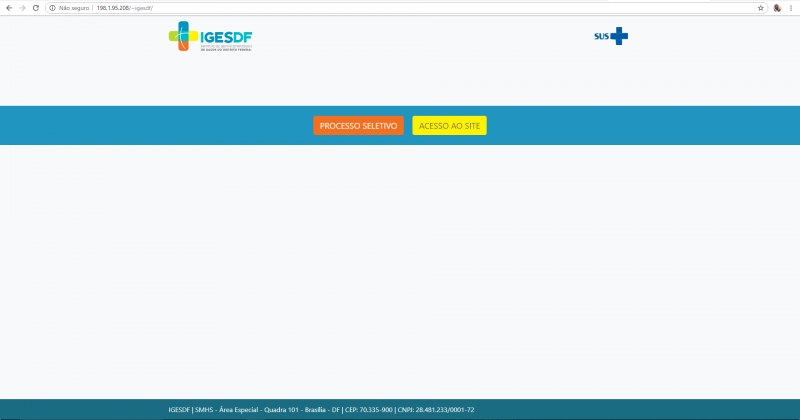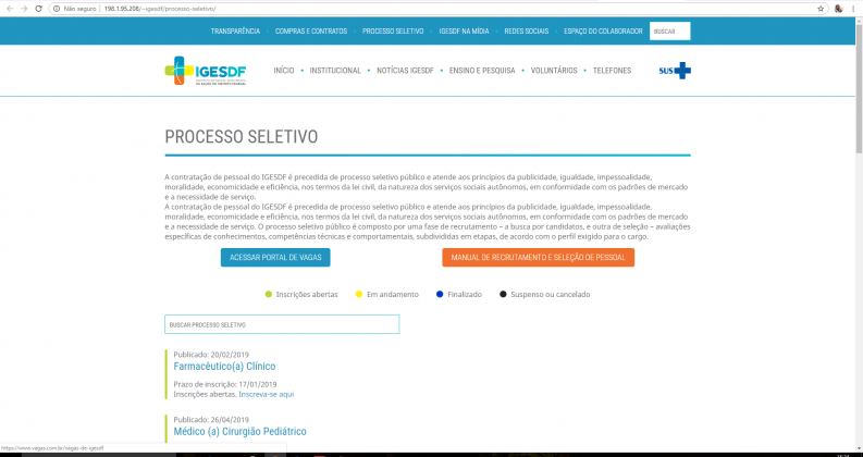 Com a sobrecarga, a ‘solução’ encontrada pelo IGESDF, foi criar dois links na página inicial do site do Instituto. Uma direcionada ao site Vagas.com e a outra, para “Entrar no site” do instituto.