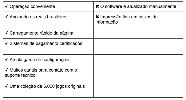 Como mencionado anteriormente, há várias seções para os jogadores. Eles têm mais de 5.000 jogos licenciados lançados por fornecedores renomados: Netent, Amatic, Igrosoft, Evolution Games. Para manter o interesse nos slots de vídeo, há torneios regulares com grandes sorteios de prêmios, que podem chegar a até 3.000 euros.