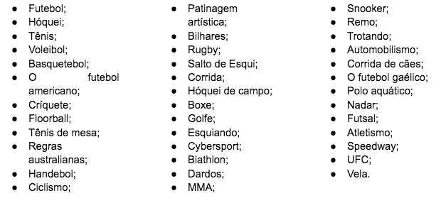 Como o site, o programa tem várias seções para apostas: Esportes, Ao Vivo, Esportes Virtuais, Toto. Mais de 1.500 eventos são oferecidos todos os dias para apostas. 1xBet aceita apostas em torneios de prestígio e obscuridade em 30 esportes: