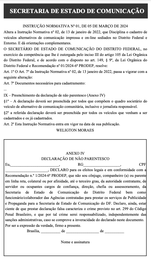 A secretaria de Estado de Comunicação do DF (Secom-DF), publicou a Instrução Normativa (IN) Nº 01, de 05 de março de 2024, em alteração a IN n.º 02 de 13 de janeiro de 202, em que passou a exigir, mediante cadastro de veículos alternativos de comunicação impressa e on-line sediados, sediados no Distrito Federal e Entorno uma declaração de não parentesco, entre os postulantes a veicular publicidade por parte da Pasta.