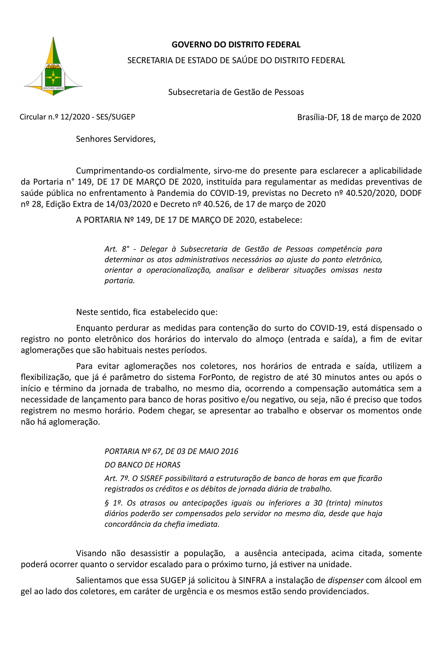 Na quarta-feira (18/Mar), a subsecretaria de Gestão de Pessoas (Sugep), da Secretaria de Estado de Saúde do DF (SES-DF), publicou a Circular n.º 12/2020 – SES/SUGEP que dispensa os servidores a registrarem os horários de entrada e saída, no ponto eletrônico, durante o horário de almoço.