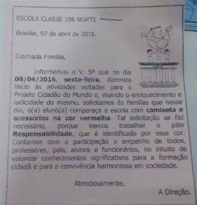 No sábado (9/Abr), Política Distrital publicou matéria intitulada ‘Pais acusam direção da Escola Classe 106 Norte de promover apoio à Dilma’ que gerou repercussão e preocupação de pais de alunos. Neste domingo(10/Abr), a direção da Escola publicou “Nota de Esclarecimento – Pilar da Responsabilidade”, na rede social, Facebook, em que explica o Pilar é parte do projeto ‘Cidadão do Mundo’, desde 2014, e acusa o Blog de não apurar o fato, o que não procede.