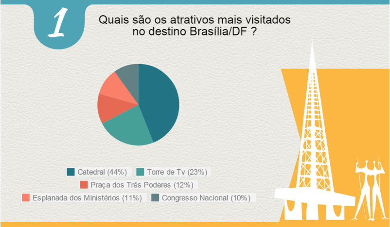 De acordo com os dados do Observatório do Turismo, de pesquisas realizadas pela Secretaria, em 2016 e 2017 e identifica o fluxo e o perfil dos turistas que visitam o DF, os atrativos mais visitados pelos turistas, são concentrados na Capital Federal. Catedral, Torre de TV, Praça dos Três Poderes, Esplanada dos Ministérios e o Congresso Nacional estão entre os principais destinos.