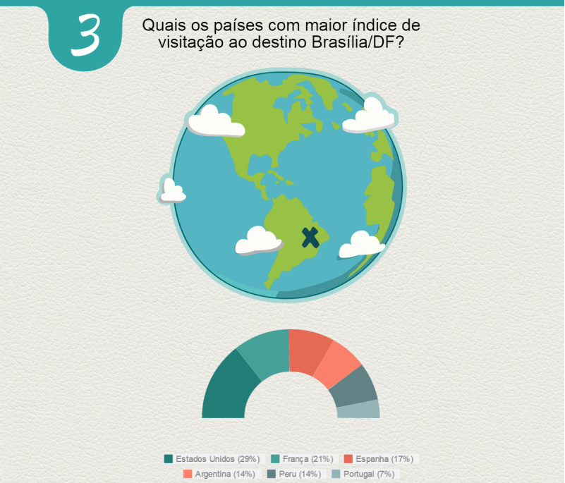 Ainda de acordo com a Secretaria, eventos como o carnaval, as Olimpiadas, estão entre os principais fatores, entre 2016 e 2017, da recepção de turistas no DF. Esses vindos, em grande maioria, de São Paulo, de Minas Gerais, de Goiás e do Paraná. Dos estrangeiros, a maioria veio da França, dos Estados Unidos, do México, da Argentina e da Colômbia.