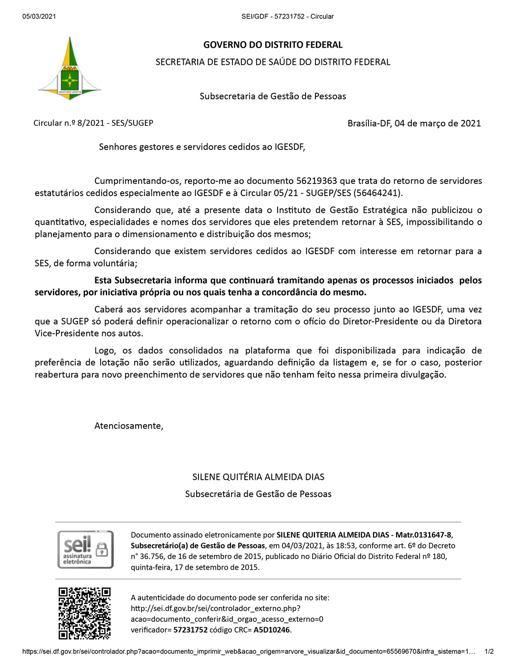 Na noite de ontem, a Subsecretaria de Gestão de Pessoas (Sugep) publicou uma circular revogando o cadastro de devolução dos servidores cedidos pela SES ao IGES. Visto que o IGES não enviou os dados solicitados pela pasta. Os únicos processos válidos serão aqueles que foram iniciados por parte e vontade do servidor.