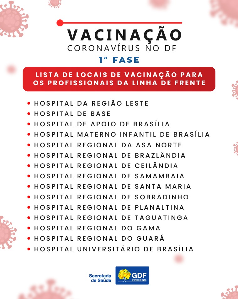 A primeira fase de vacinação contra COVID-19 terá como público-alvo os seguintes profissionais: Médicos, enfermeiros, técnicos de enfermagem, fisioterapeutas que atuam nas UTIs, profissionais administrativos que fazem a ficha de atendimento dos pacientes, vigilantes, profissionais de limpeza que atuam em hospitais e UBSs, Samu, bombeiros que estão no atendimento pré-hospitalar, profissionais da atenção primária que estão no atendimento a pacientes com sintomas respiratórios.