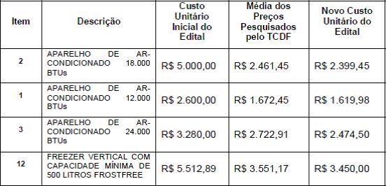 Veja abaixo a comparação entre os preços do edital antes e depois da atuação do TCDF:
