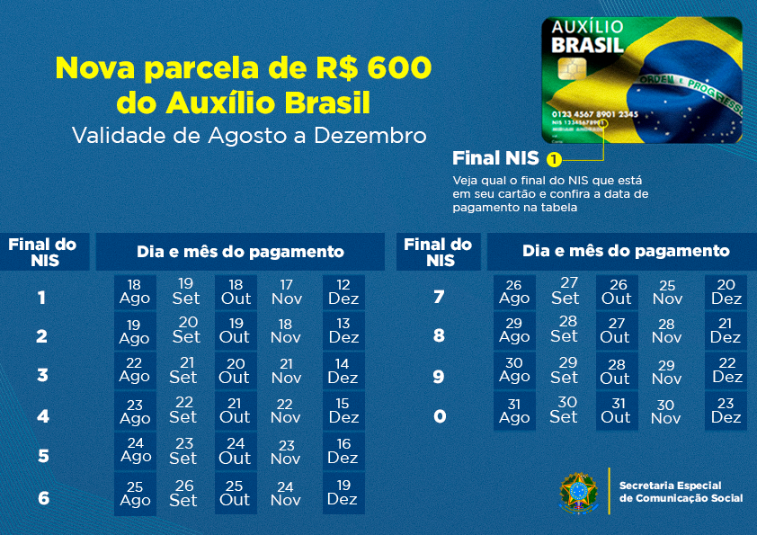 O Auxílio Brasil com valor de R$ 600 começa a ser pago no próximo dia 18 de agosto aos beneficiários com Número de Identificação Social (NIS) terminado em 1. No dia 31 de agosto, será depositada a primeira parcela com valor atualizado àqueles com inscrição do NIS com final zero.