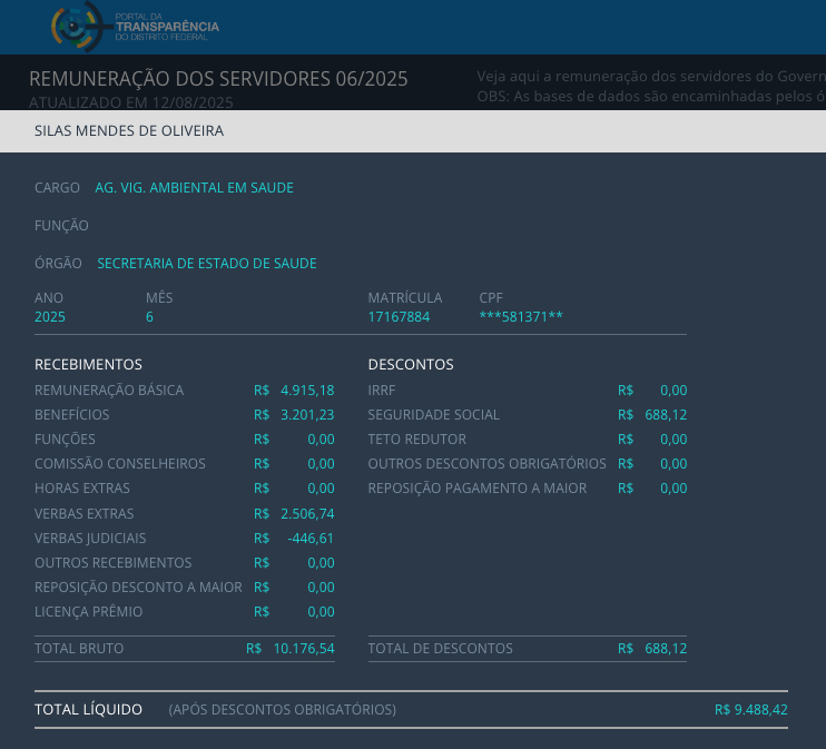 Com salário líquido de aproximadamente R$ 9,48 mil, somado remuneração básica e benefícios, um Agente de Vigilância Ambiental em Saúde (AVAS) da Secretaria de Saúde do DF (SES-DF), em estágio probatório, é acusado de ter faltado ao trabalho na manhã de 12 de agosto para participar de uma manifestação de outra categoria. A denúncia, recebida por PDNews, coloca Silas Mendes de Oliveira, ex-funcionário do Sindicato dos Empregados em Estabelecimentos de Saúde de Brasília (SindSaúde-DF), a participar de um ato promovido pela entidade sindical, realizada no edifício PO700. A manifestação tratava de pautas específicas de Auxiliares Operacionais de Serviços Diversos (AOSDs).