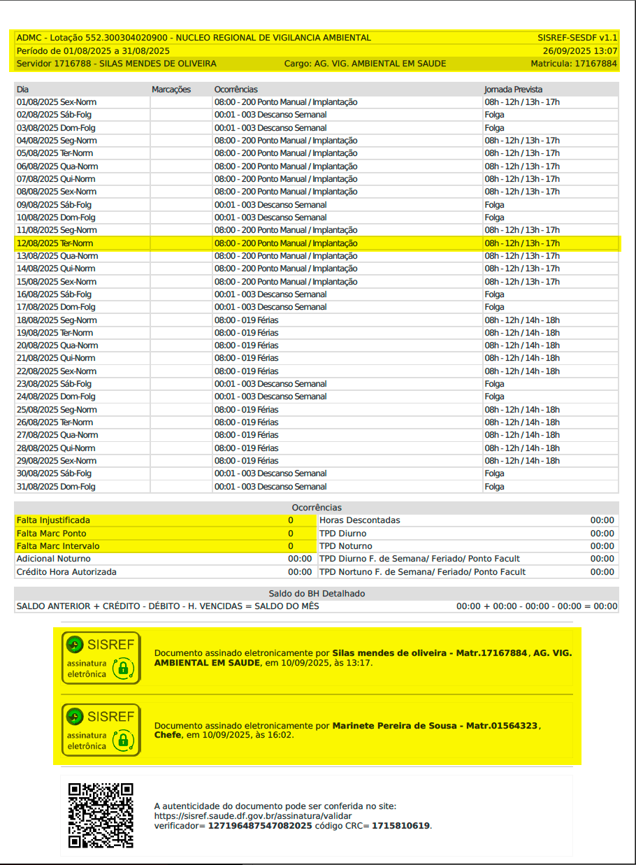 Dentre os documentos recebidos, chamou atenção de PDNews a folha de ponto de Oliveira. Pois embora o AVAS tenha participado do ato do SindSaúde-DF para tratar de questões dos AOSDs, o servidor teve o ponto devidamente endossado como se estivesse a trabalhar por todo o período, normalmente, sem registro de ocorrência de falta injustificada, em que consta jornada de 08h às 12h / 13h às 17h, com a ocorrência 200, indicação que o servidor trabalhou, normalmente.