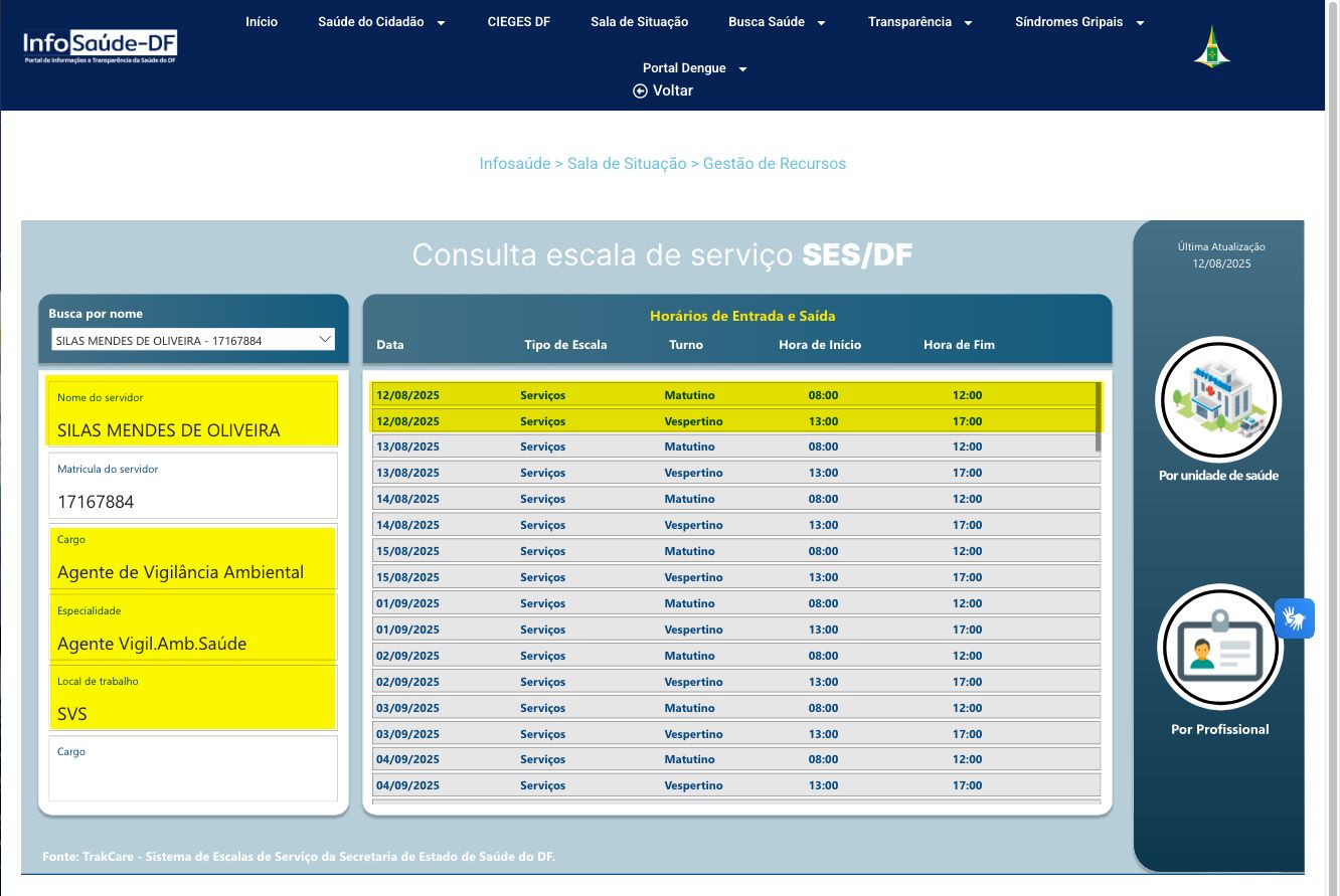 Além da escala, PDNews teve acesso ao InfoSaúde-DF, onde foi possível constatar que na manhã de 12 de agosto, Oliveira estava escalado para trabalhar normalmente, no combate a endemias, a exemplo do mosquito da dengue.