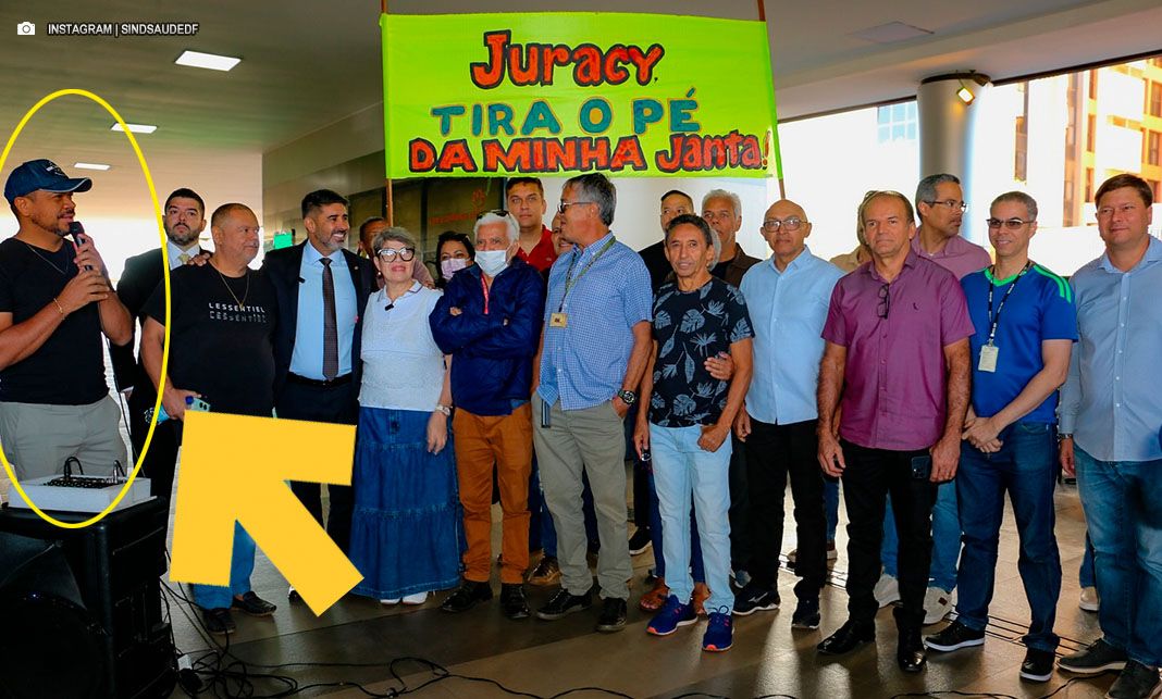 Embora estivesse a participar de manifestação do Sindicato dos Empregados em Estabelecimentos de Saúde de Brasília (SindSaúde-DF), em 12 de agosto, sobre demandas de Auxiliares Operacionais de Serviços Diversos (AOSDs), o Agente de Vigilância Ambiental em Saúde (AVAS) da Secretaria de Saúde do DF (SES-DF), Silas Mendes de Oliveira, em estágio probatório, teve presença confirmada na folha de ponto.