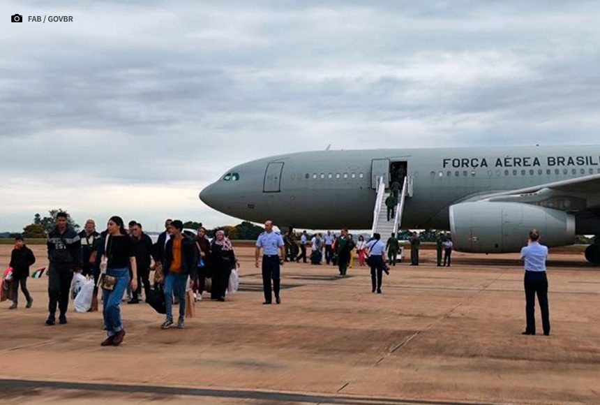 Em mais uma etapa da Operação Voltando em Paz, uma aeronave KC-30 da Força Aérea Brasileira (FAB) aterrissou na Base Aérea de Brasília neste sábado (23), às 6h53 (de Brasília). O voo trazendo 16 brasileiros e binacionais e 14 familiares palestinos resgatados de Gaza havia decolado às 21h55 (horário local, 16h55 de Brasília) desta sexta (22) do Aeroporto do Cairo, no Egito. Dos 30 repatriados, 14 são crianças, 11 mulheres e cinco homens.