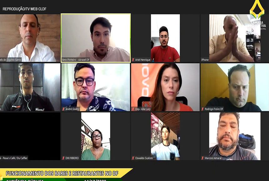 Donos de bares e restaurantes, músicos e representantes da Saúde e da Vigilância Sanitária do Distrito Federal participaram de audiência pública remota, nesta segunda-feira (14), para discutirem o decreto do governador que restringiu o funcionamento desses estabelecimentos até as 23h. Após mais de duas horas de discussão, sob a coordenação da deputada Júlia Lucy (Novo), construiu-se uma proposta a ser negociada com o governo: nos últimos 15 dias do ano, bares e similares poderiam funcionar até 1h da manhã, estando sujeitos a ampla fiscalização, inclusive com a participação da Polícia Militar no período. Saúde e Vigilância Sanitária, contudo, se posicionaram com reservas.