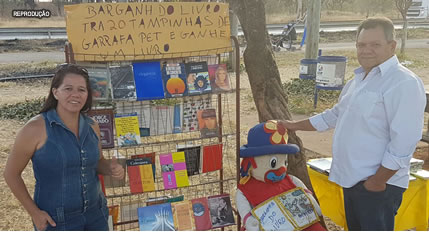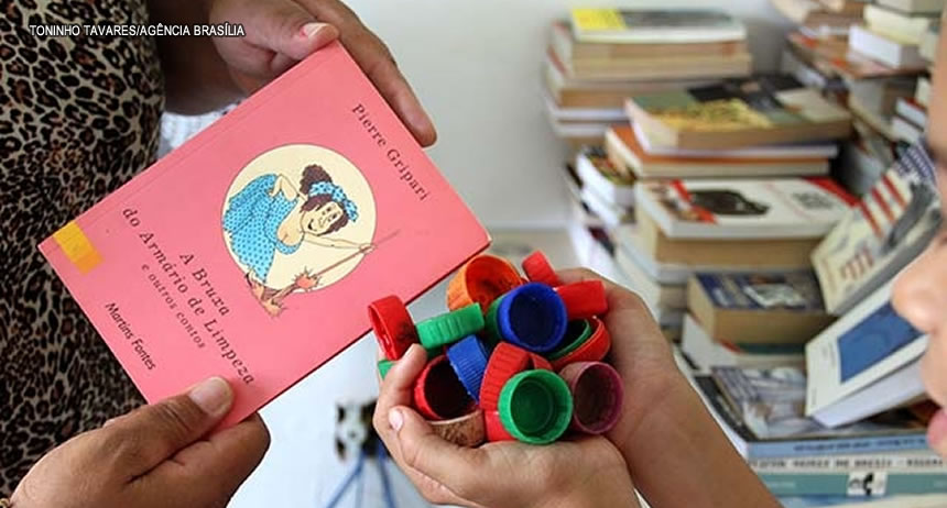 A líder comunitária, Valéria Correia, é responsável pelo projeto Barganha do Livro no Itapoã, cidade localizada a cerca de 25Km do centro de Brasília. Crianças e adolescentes da região são incentivados a juntarem 20 tampinhas de garrafas de plástico para trocarem por um livro – é o prêmio pela coleta do que iria para o lixo.