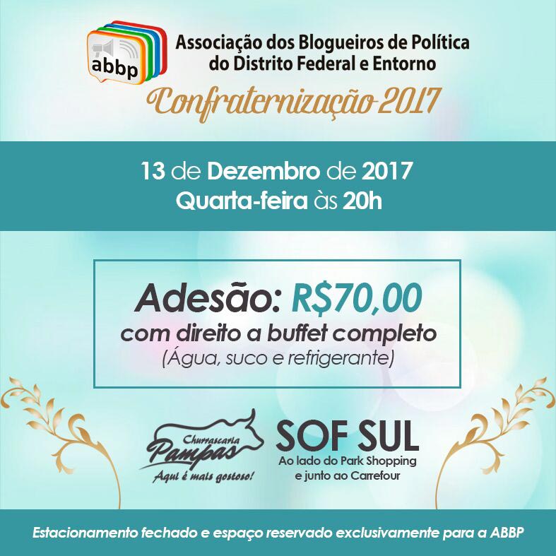 Com mais de 40 associados, celebrando 3 anos de existência e atuação na capital federal a Associação dos Blogueiros de Política do Distrito Federal e Entorno (ABBP) realiza, nesta quarta-feira, 13 de dezembro, às 20 horas, um jantar de confraternização, na Churrascaria Pampas, no Setor de Oficinas Sul ao lado do Park Shopping junto ao Carrefour.