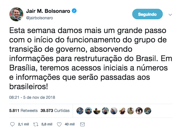 Na manhã, uma postagem no perfil oficial do presidente, eleito, Jair Bolsonaro (PSL), na rede social Twitter, que pode ter passado despercebido a milhões de brasileiros, mas se faz reveladora. “Esta semana damos mais um grande passo com o início do funcionamento do grupo de transição de governo, absorvendo informações para restruturação do Brasil. Em Brasília, teremos acessos iniciais a números e informações que serão passadas aos brasileiros!”.