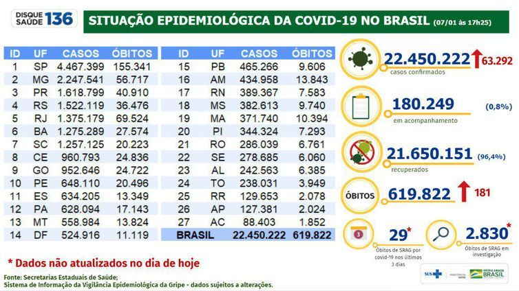 O número de pessoas infectadas desde o início da pandemia chegou a 22.450.222. Ontem (6), o painel de informações sobre a pandemia do Ministério da Saúde contabilizava 22.386.930.